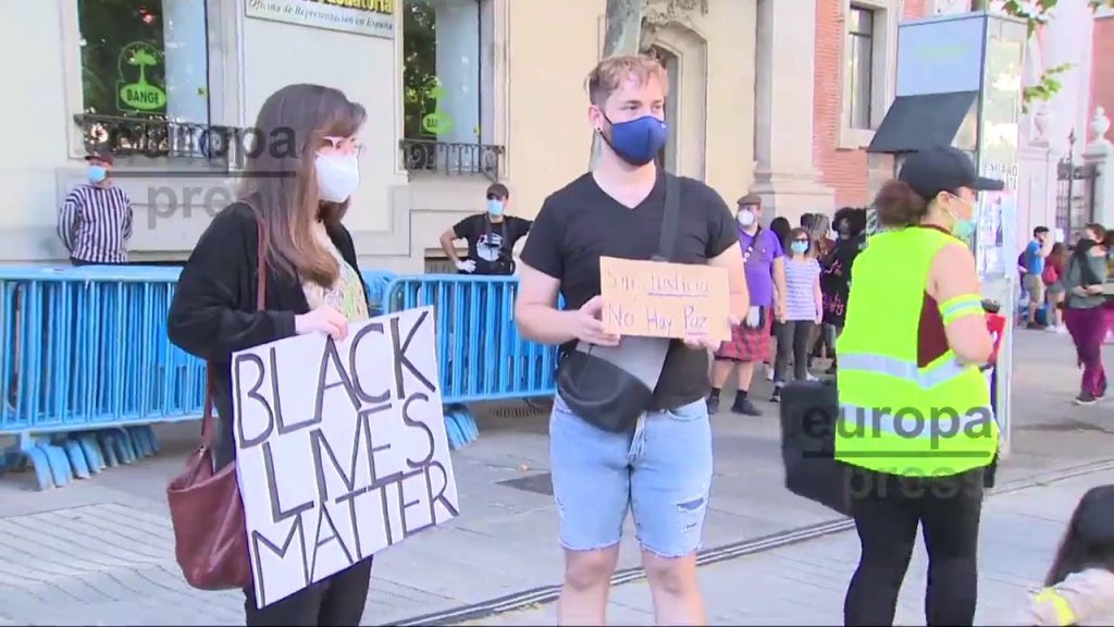 Miles de personas se han concentrado este domingo frente a la Embajada de Estados Unidos en Madrid contra el racismo y por la muerte de George Floyd, ciudadano negro que murió víctima de los abusos policiales el pasado 25 de mayo en Mineápolis.