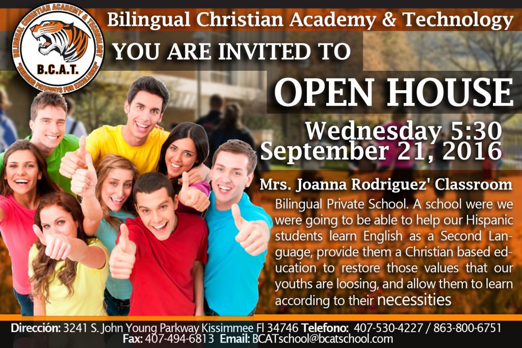 Hoy miércoles 21 de septiembre de 2016 se estará llevando a cabo la gran apertura de BILINGUAL CHRISTIAN ACADEMY & TECHNOLOGY  a las 5:00 p.m. que está ubicada en 3241 S. John Young Parkway Kissimmee Fl 34746. Nos gustaría contar con su presencia a este importante evento haciendo la diferencia en la ciudad de Kissimmee para la educación bilingue tan necesaria en nuestros niños y jóvenes.