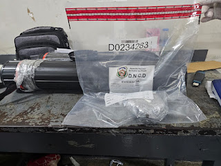 En un segundo operativo, realizado en el Inposdom, las unidades de la DNCD, apoyados por inspectores, intervinieron un paquete, donde se ocupó un portaplanos, conteniendo dentro (oculta) una porción de cocaína, con un peso preliminar de 385 gramos.