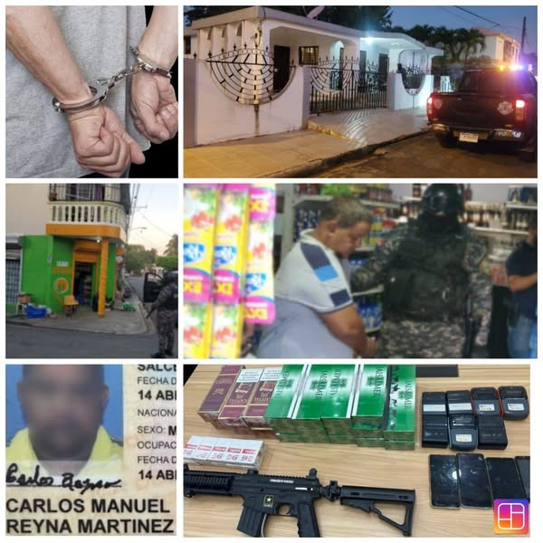 En otro allanamiento, efectuado en un establecimiento comercial del mismo sector y propiedad de Carlos Manuel Reyna Martínez, se ocuparon un arma larga tipo rifle, color negro, serie No. 0395198, 20 paquetes de cigarrillos de distintas marcas, 7 máquinas tipo Verifone para venta de lotería ilegal y cuatro celulares de diferentes marcas y modelos.