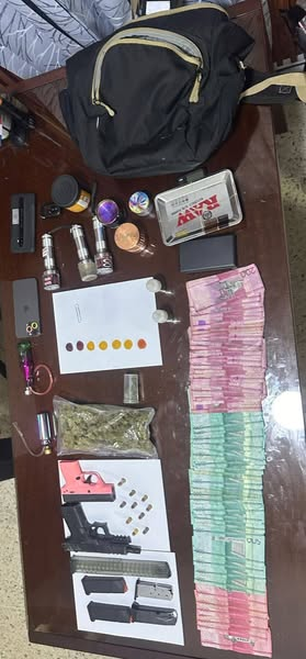 También se incautaron 100 gramos de presunta marihuana, seis trituradoras de marihuana, dos balanzas, siete gomitas de marihuana, dos frascos de líquido para marihuana y dos quemadores para su consumo.