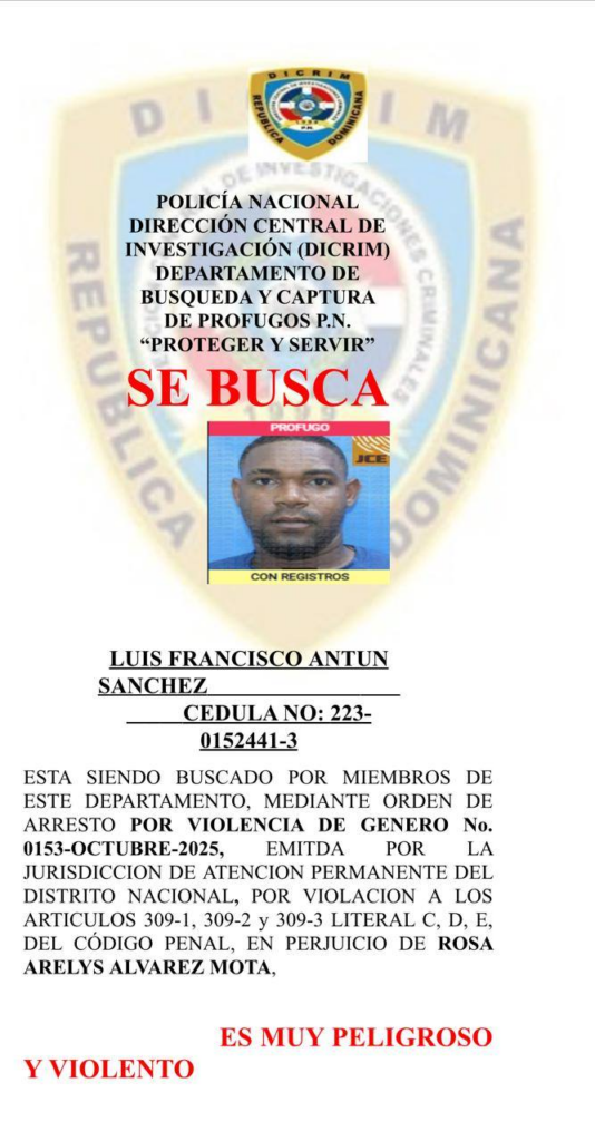Se trata de Luis Francisco Antún Sánchez, cuyo operativo de búsqueda fue desplegado por miembros del Departamento Operativo II, Unidad Central de Búsqueda y Captura de Prófugos, Rebeldes y Condenados, quienes se trasladaron a los sectores Villa Francisca y Villa Fontana, del Distrito Nacional, con la finalidad de ejecutar la orden de arresto No. 0153-OCTUBRE-2025, emitida el 13 de octubre del presente año por la Coordinación de los Juzgados de la Instrucción del Distrito Nacional.