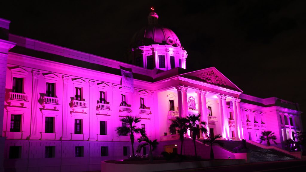 Palacio Nacional, R. D.-La fachada del Palacio Nacional fue irradiada con luces rosadas, color primordial de la campaña contra el cáncer. Iniciativa del Despacho de la Primera Dama, que involucra a otras instituciones del Estado y del sector privado.