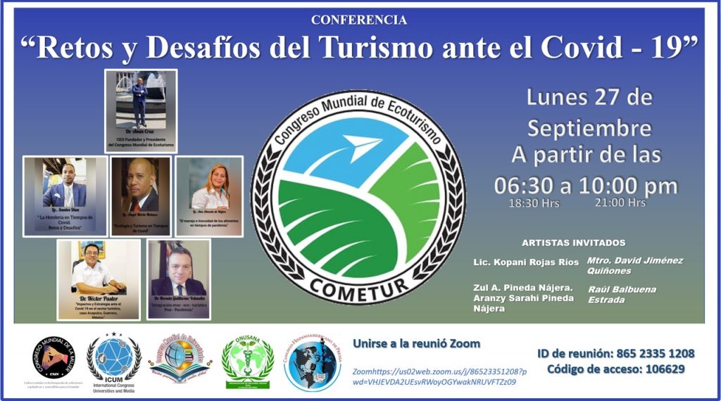 El Congreso Mundial de Ecoturismo, COMETUR, celebrá hoy lunes 27 una magistral conferencia titulada “LOS RETOS Y DESAFÍOS DEL TURISMO ANTE EL COVID -19″ en este Día Mundial del Turismo, este lunes 27 de septiembre de 6:30 a 10:00pm, donde se articulará el tema turismo, empleo, gastronomía, hoteles, transporte, salud, viaje, avión, medio ambiente etc.