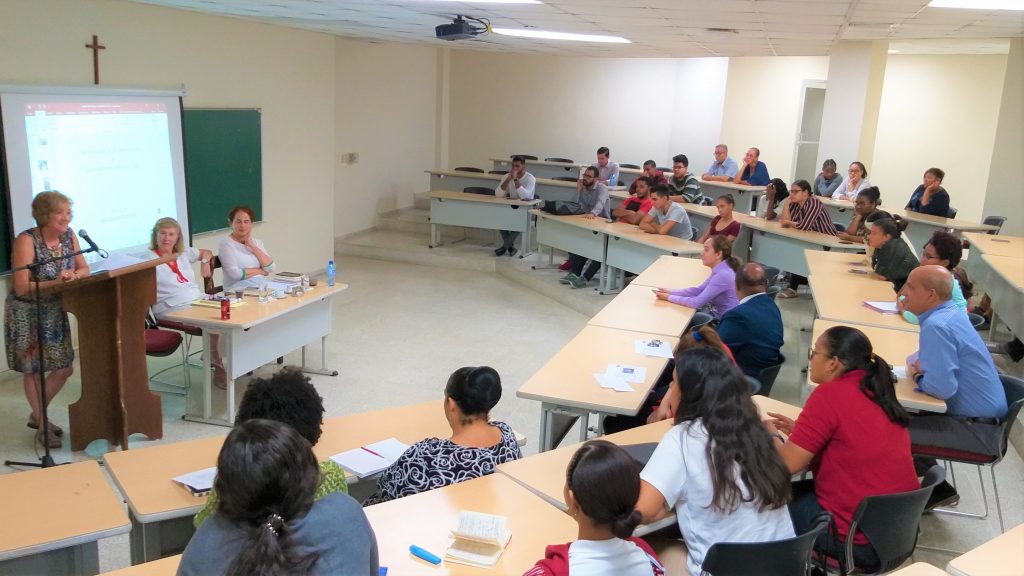 El encuentro tuvo en aula octagonal del Edificio B-1 del campus capitalino de la Pontificia Universidad Madre y Maestra y las figuras centrales: María Cristina Galán Rubio y María Antonia García de León Álvarez, dos premiadas poetas españolas con un sabor exquisito a firmeza vestida de ternura y calidad lirica.