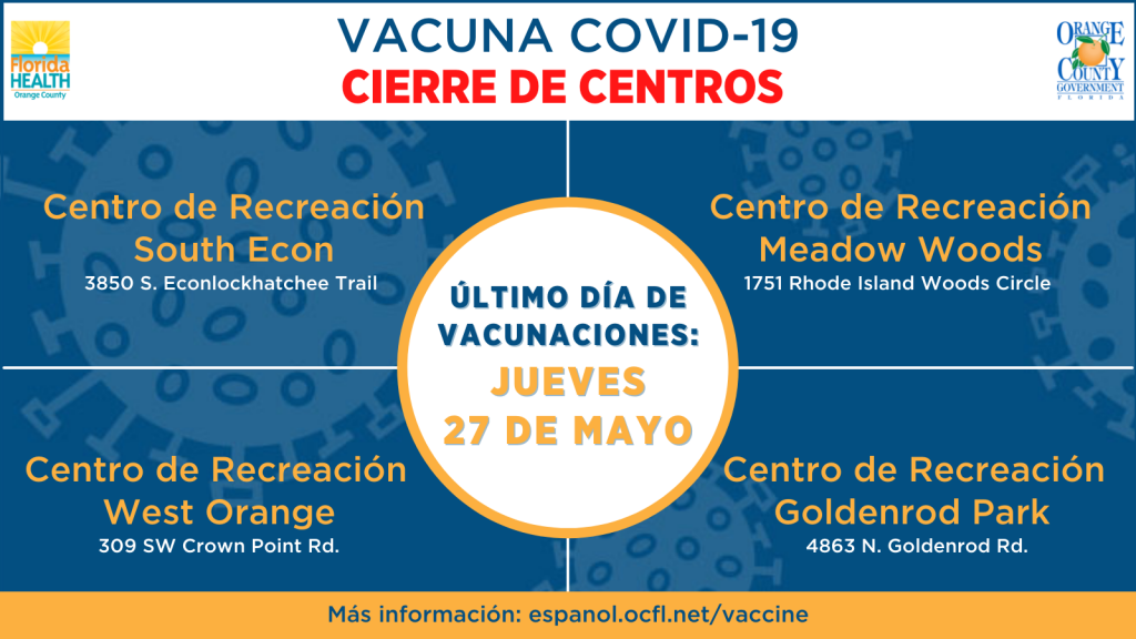 Cuatro sitios de vacunas COVID-19 del Centro Recreativo del Condado de Orange cerrarán permanentemente hoy 27 de mayo de 2021 a las 7:00 p.m. Los sitios están ubicados en los gimnasios Goldenrod, Meadow Woods, South Econ y West Orange Rec Center.
