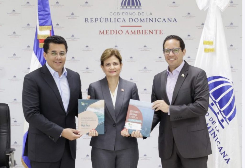 La vicepresidenta de la República, Raquel Peña, en su calidad de ministra interina de Medio Ambiente y el ministro de Turismo, David Collado, recibieron de manos del director ejecutivo de la Dirección General de Alianzas Público-Privadas (DGAPP), Sigmund Freund, los resultados de los estudios de capacidad de carga turística realizados en Cabo Rojo y Bahía de las Águilas.