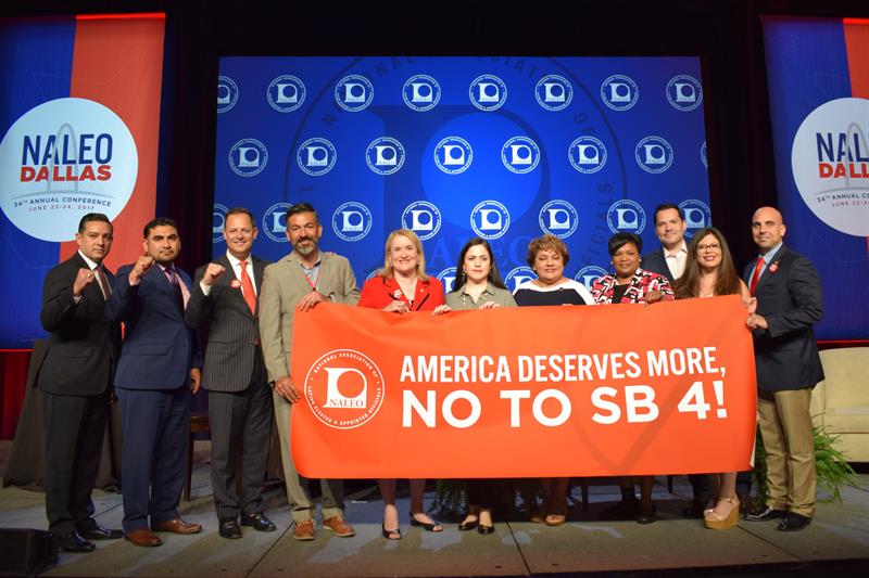 Hispanic legislators and senators from Texas, (from left to right) César Blanco, Armando Walle, Rafael Anchía, Ramón Romero, Sylvia García, Ana Hernández, Pauline Medrano (president of the National Association of Latino Elected Officials (NALEO) Toni Rose, Justin Rodriguez, Mary Gonzalez and Armando Martínez, hold a banner that reads "The United States Deserves More, Not SB4", alluding to a Texas anti-immigrant law today, Thursday June 22, 2017, within the framework of the celebration Of the 34th NALEO Annual Conference in Dallas, Texas. EFE