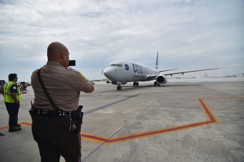 Un oficial de la Policía de Miami-Dade toma una fotografía al avión que transporta al oficial Mario Gutiérrez hoy, jueves 19 de mayo 2016, en el aeropuerto de Miami, Florida. Gutiérrez, quien arriesgó de su propia vida para evitar una catástrofe, fue recibido hoy en el aeropuerto de Miami como un héroe tras ser condecorado por el presidente Barack Obama con la Medalla del Valor, la más alta distinción nacional que se otorga a un agente de seguridad. EFE/Gastón de Cárdenas