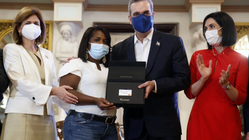 Yenny Constanza, de la Comunidad de El Higüero, en Santo Domingo Norte, fue la primera beneficiaria de la tarjeta, la cual recibió de las manos de Abinader.