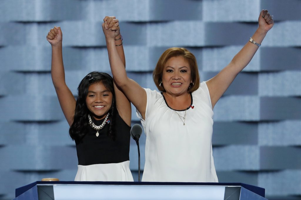 Karla Ortiz, de 11 años, y su madre Francisca Ortiz hablan durante el primer día de la Convención Nacional Demócrata el lunes 25 de julio de 2016 en Filadelfia. (AP Foto/J. Scott Applewhite)