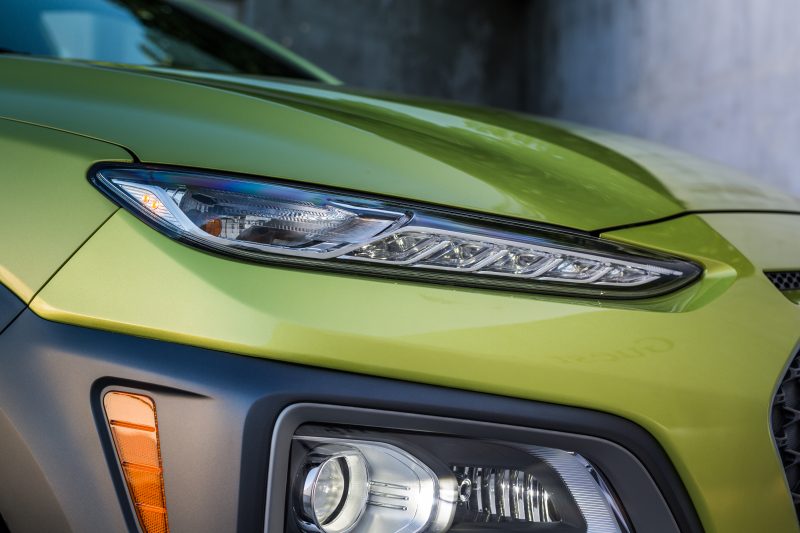 El diseño exterior del Kona es llamativo…quizás demasiado. Algunos tal vez piensen que es extremo, pero en mi opinión, armoniza bien con líneas modernas de diseño y mantiene viva la coherencia con los productos del fabricante. Con su estilo peculiar, el Kona se presenta apetitoso para divertirse. Futuros compradores podrán elegir entre un motor de 147 caballos de 2.0 litros y cuatro cilindros en línea o un turbo de 175 caballos de fuerza y transmisión de 7 velocidades de doble embrague. Una pantalla táctil estándar de 7.0 pulgadas incluye Apple CarPlay y Android Auto, mientras que una unidad de 8.0 pulgadas con navegación y carga inalámbrica es opcional.