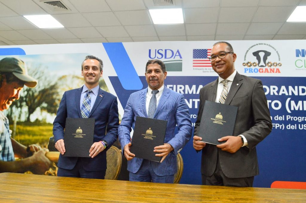 SANTO DOMINGO. – El Ministerio de Agricultura de la República Dominicana y la Asociación Nacional de Empresas Cooperativas/Liga de Cooperativas Internacional (NCBA/CLUSA), suscribieron un memorándum de entendimiento para continuar el apoyo a los sectores cárnicos y lácteos de la República Dominicana en el marco del Programa Fortaleciendo la Cadena de Valor de la Ganadería Dominicana (PROGANA), financiado por la Embajada de los Estados Unidos a través de su Departamento de Agricultura (USDA).