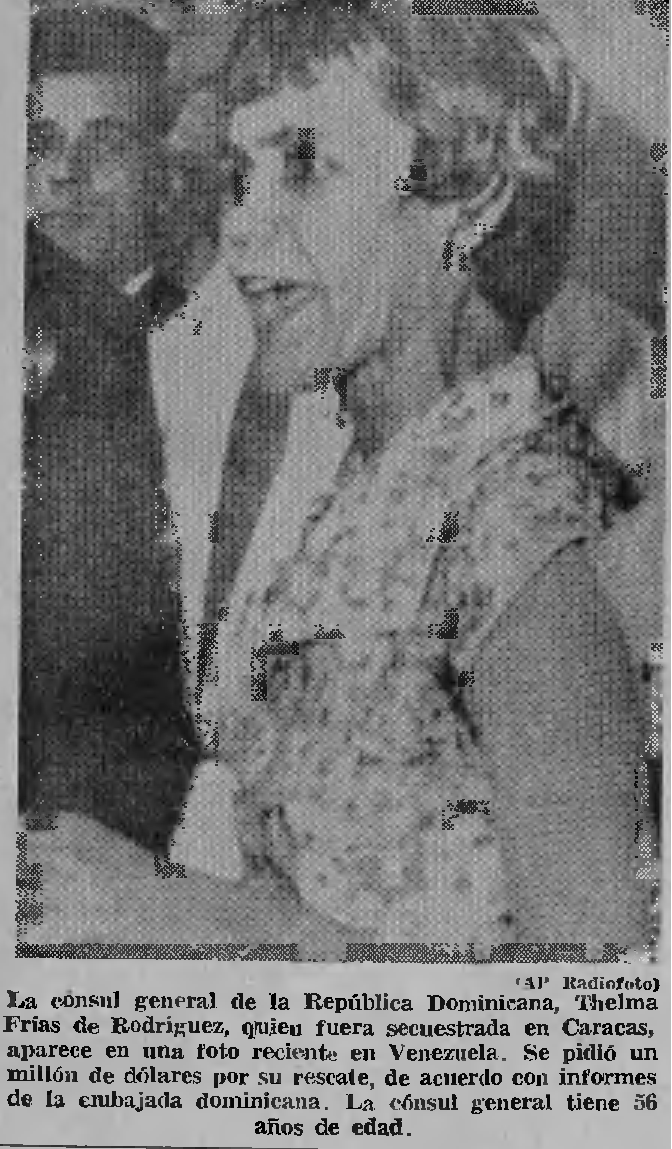 El 1ro. de octubre de 1971 corría como pólvora en Santo Domingo la información de la misteriosa desaparición en Caracas de la señora Thelma Frías Montalvo de Rodríguez, de 56 años, una antigua profesora de la sociedad petromacorisana que había trascendido en el país por su controversial actuación como dirigente perredeísta y vicepresidenta del Senado durante el breve mandato constitucional del profesor Juan Bosch en 1963; y que fungía ahora como cónsul general de la República Dominicana en la capital de Venezuela, ya que desde 1966 era una entusiasta colaboradora del presidente Joaquín Balaguer.