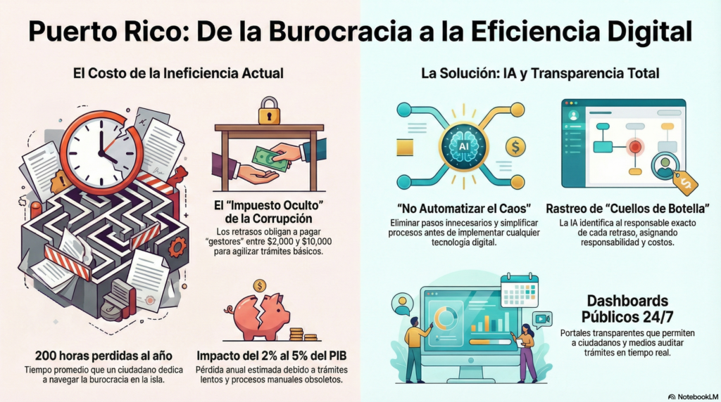 Los costos son tangibles: un estudio del Banco Mundial estima que la burocracia ineficiente en América Latina genera pérdidas anuales equivalentes al 2-5% del PIB por demoras en trámites. En Puerto Rico, donde la infraestructura educativa y de servicios enfrenta desafíos post-desastres, un ciudadano común gasta en promedio 200 horas al año navegando burocracia, según datos del Índice de Facilidad para Hacer Negocios. Retrasar información no es neutral; es un impuesto oculto que golpea desproporcionadamente a las comunidades latinas, emprendedores y medios locales que dependen de respuestas ágiles para informar y empoderar.