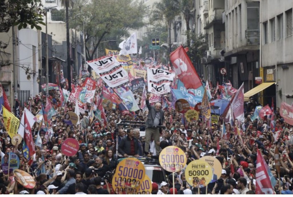 Fue acompañado por miles de personas que ondearon banderas variopintas de centrales sindicales, colectivos LGBTI, grupos de negros y feministas, pero principalmente las rojas de su Partido de los Trabajadores.