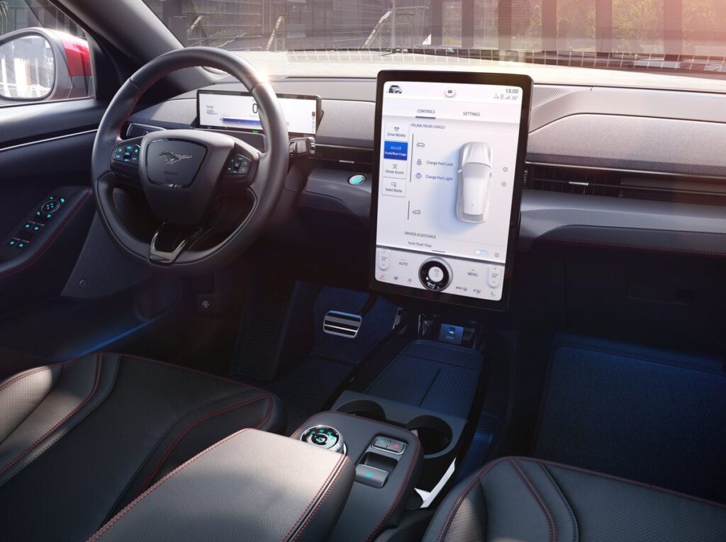 Como mencionamos anteriormente, la pieza central en la cabina del Mach-E es una gran pantalla táctil de 15,5 pulgadas o 39 centímetros. Montada verticalmente, ejecuta el sistema de infoentretenimiento Sync de nueva generación de Ford. Este sistema está diseñado para ser intuitivo y puede personalizarse con hasta tres perfiles de conductor.