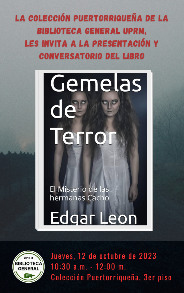 El jueves 12 de Octubre se llevará a cabo una presentación de la novela de misterio del Dr. Edgar León, “Las Gemelas de Terror”. La misma se llevará a cabo en la biblioteca de la Universidad de Puerto Rico, Recinto de Mayagüez.La estarán pasando por Facebook Live para beneficio de todos los estudiantes universitarios, lectores y colegas que no puedan asistir fisicamente. La novela ya esta disponible por Amazon Kindle y por Amazon de libros de papel.