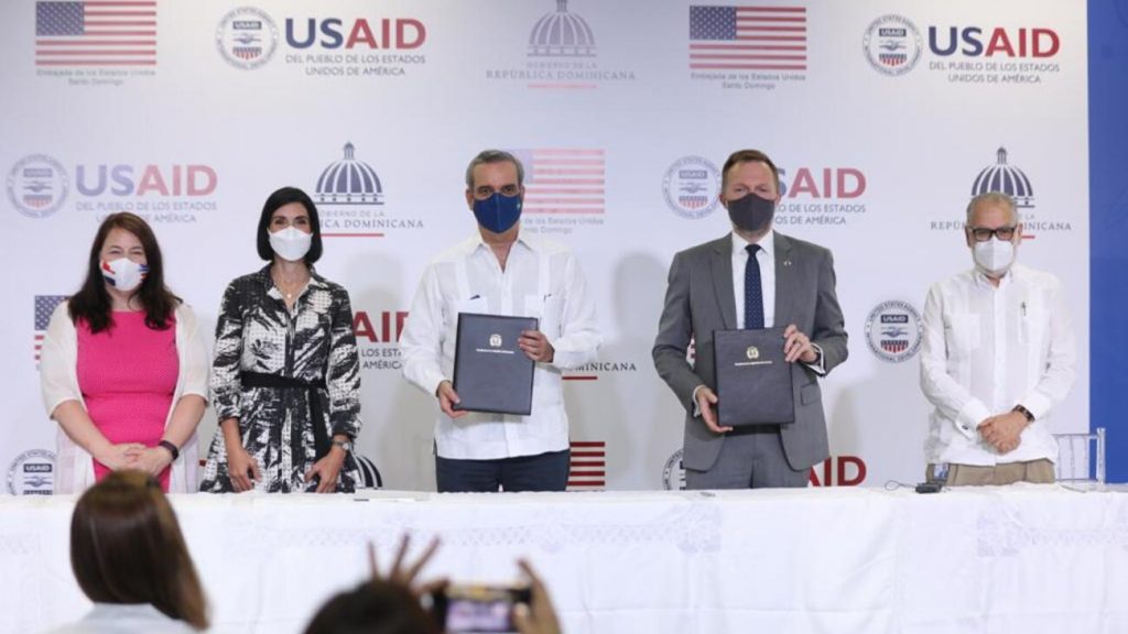 El acuerdo fue firmado por el presidente Abinader y el encargado de Negocios de la Embajada de los Estados Unidos, Robert W. Thomas. Le acompañaron en la mesa de honor la primera dama, Raquel Arbaje; la directora de la USAID, Rebecca Latorraca y el ministro de Economía, Planificación y Desarrollo, Miguel Ceara Hatton.