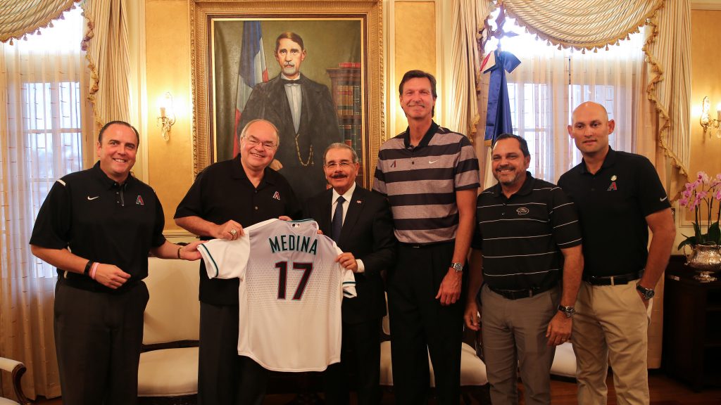 Danilo Medina recibió una chaqueta con el número 17 del equipo Los Diamondbacks de Arizona. El jefe de Estado y los ejecutivos del equipo compartieron gratamente y se expresaron mutua admiración.