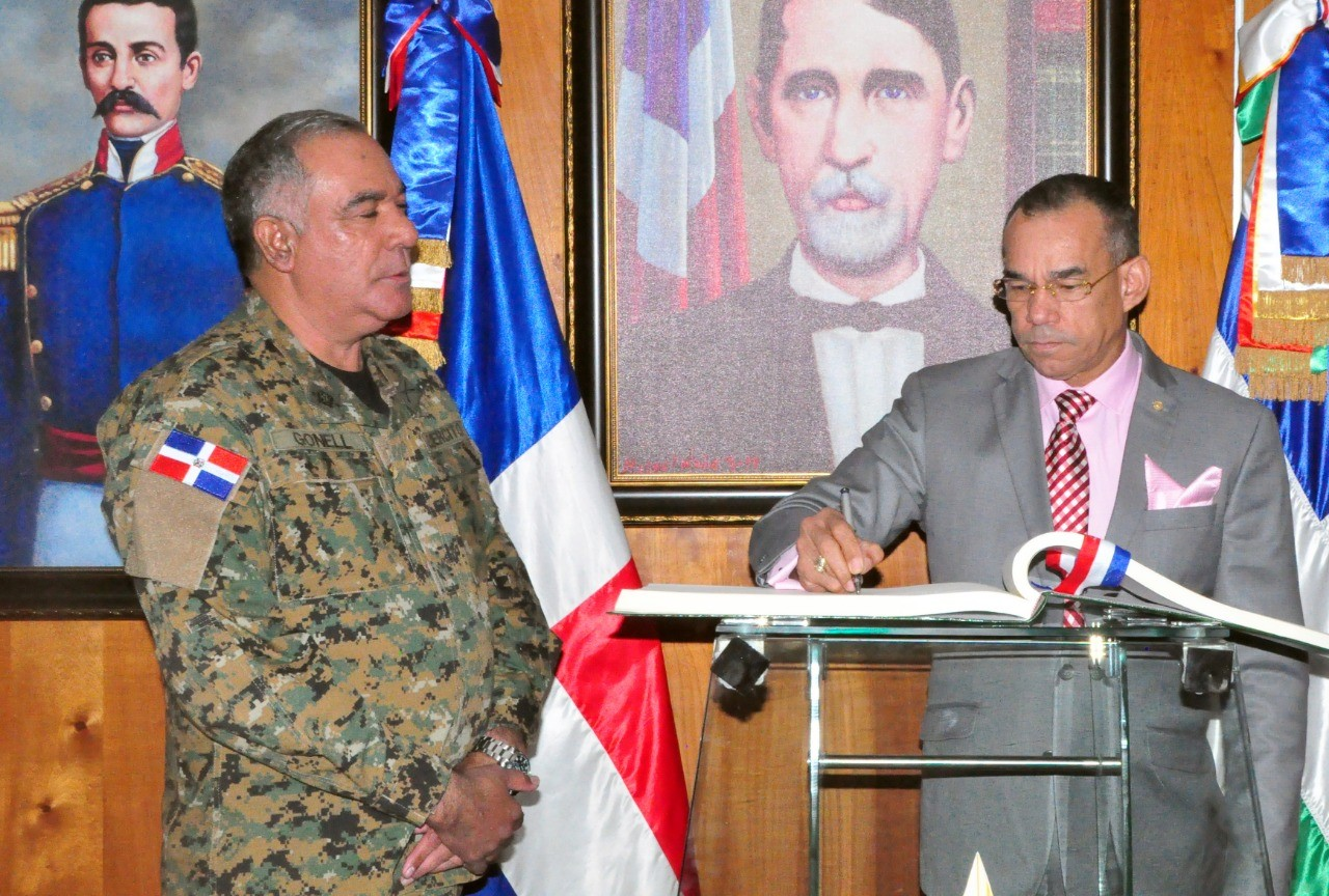 Félix Alburquerque Compres firma el libro de Visitante distinguido, a su derecha observa el Mayor General Etanislao Gonel Regalado, Comandante General del Ejercito de la REepublica Domincana.