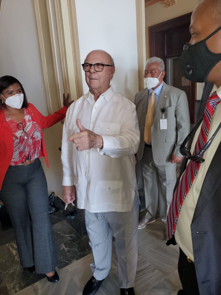Después de saludarnos con mucho cariño el ex-gobernante quien estaba acompañado de su nieto el Vice-ministro Juan Garrigo Mejía de una parte de su Seguridad Personal también estaba acompañado del General Selin Rubio Terrero, Jefe del Cuerpo de Ayudantes Militares, los cuales le acompañaron a bajar las escalinatas del Palacio Nacional a sus vehículos para retirarse de la casa de Gobierno Dominicano.