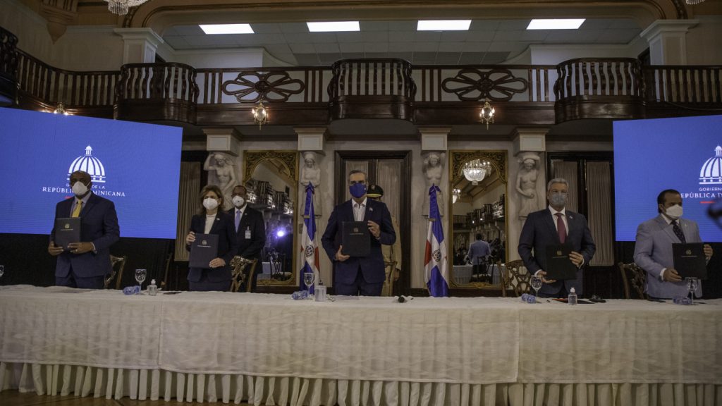 Además del jefe de Gobierno, entre los firmantes del pacto figuran la vicepresidenta de la República, Raquel Peña; los ministros de la Presidencia y administrativo de la Presidencia, Lisandro Macarrulla y José Ignacio Paliza; de Energía y Minas, Antonio Almonte; el presidente del Consejo Económico y Social (CES), Rafael Toribio, así como el director ejecutivo del Gabinete Eléctrico, Celso Marranzini.