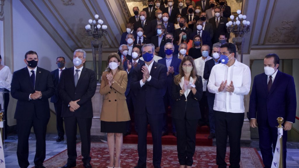 Acompañaron al presidente, la vicepresidenta Raquel Peña; el ministro de la Presidencia, Lisandro Macarrulla; el ministro Administrativo, José Ignacio Paliza; el ministro de Turismo, David Collado; el ministro de Trabajo, Luis Miguel de Camps.