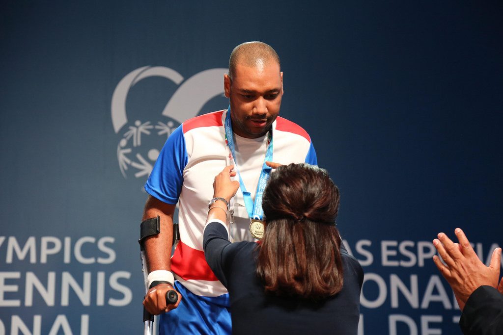 Santo Domingo, Este, R. D.-La primera dama de la República, Cándida Montilla de Medina, encabezó en el Parque del Este la primera ceremonia de premiación del Invitacional Mundial de Tenis de Olimpiadas Especiales Santo Domingo 2018, en que el dominicano Juan Alfredo Reyes, compitiendo en sencillos del grupo M01 del nivel 2, conquistó la primera medalla de oro para el país.