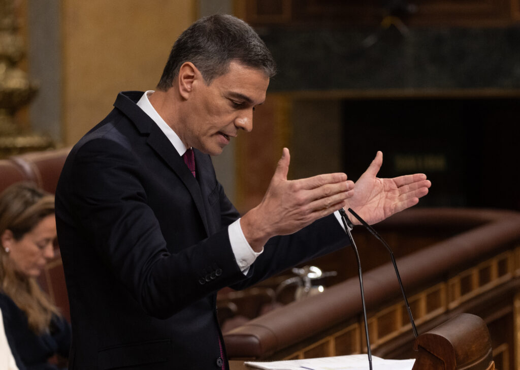 El presidente del Gobierno, Pedro Sánchez, interviene durante una sesión plenaria, en el Congreso de los Diputados, a 10 de abril de 2024, en Madrid (España). El presidente del Gobierno comparece ante el Pleno hoy para informar, a petición propia, del Consejo Europeo Ordinario celebrado los días 21 y 22 de marzo y, a petición del Grupo Popular, para dar cuenta de cómo se organizó su reciente viaje oficial a Marruecos, y sobre los asuntos abordados, especialmente, aquellos pendientes tras la última XII RAN Marruecos-España. Además, durante la sesión plenaria tendrá especial relevancia la guerra en Gaza.
